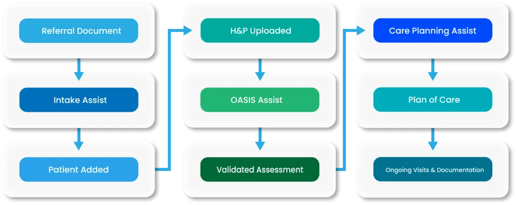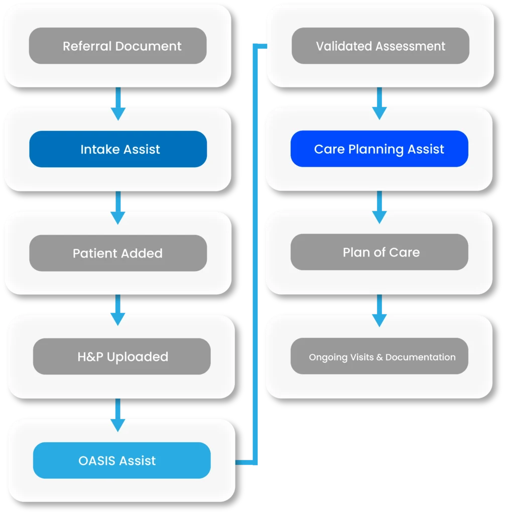 Each integration builds on the previous one. Documents extracted by Intake Assist inform the OASIS process. Validated OASIS data powers Care Planning recommendations. The result: a complete, accurate patient record with a goal-focused care plan in a fraction of the time.