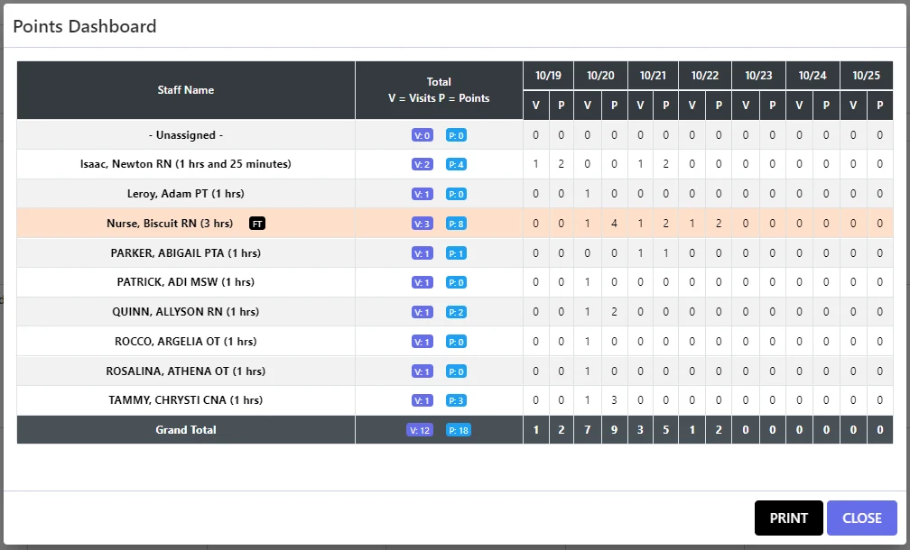 Each visit type (e.g., Start of Care, Recertification, Routine Visit) can now be assigned a point value based on agency policy.